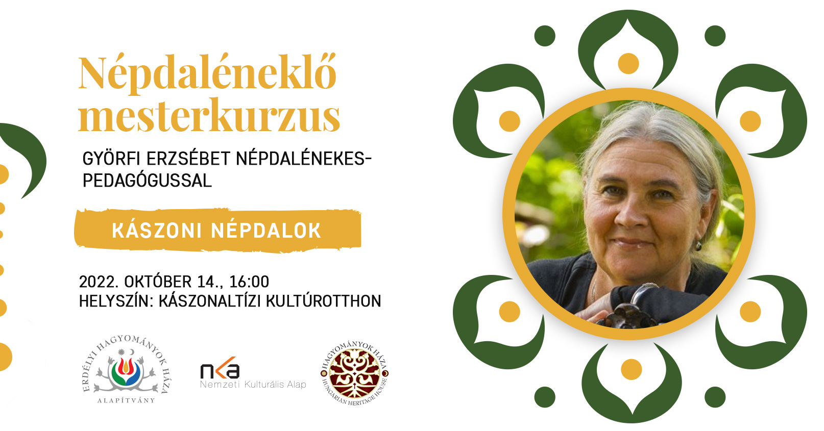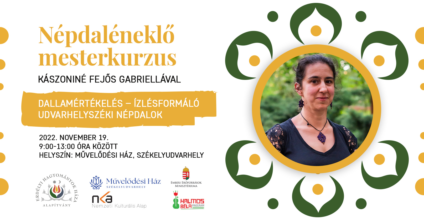 Népdaléneklő mesterkurzus programunk több megyére és helyszínre kiterjed, és több népdalénekes-oktató bevonásával valósul meg. Székelyudvarhelyen november 19-én Kászoniné Fejős Gabriella tart dallamértékelést, ízlésformáló udvarhelyszéki népdalokkal fognak foglalkozni a résztvevők.